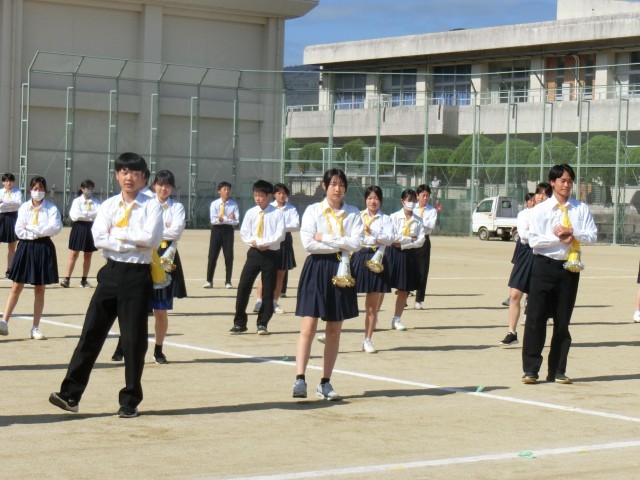 本番と同じように衣装を身につけて、グラウンドでの立ち位置や声の大きさなどを細かく確認していました。