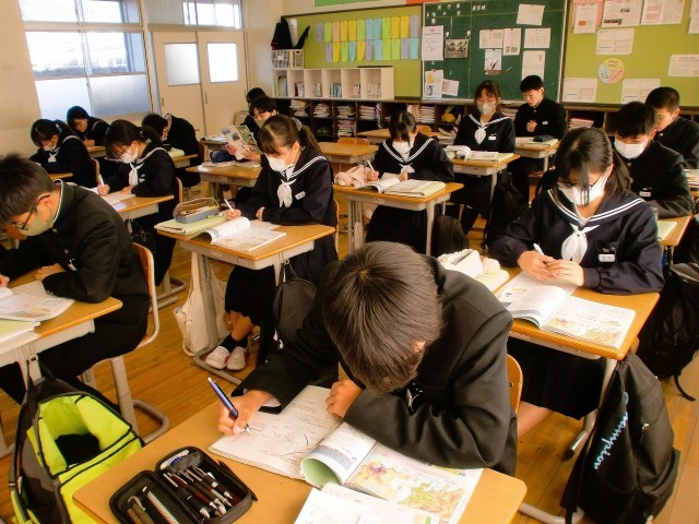 2Aは社会で、関東地方の自然環境について、地図を見ながら調べています。