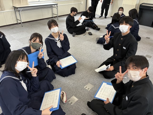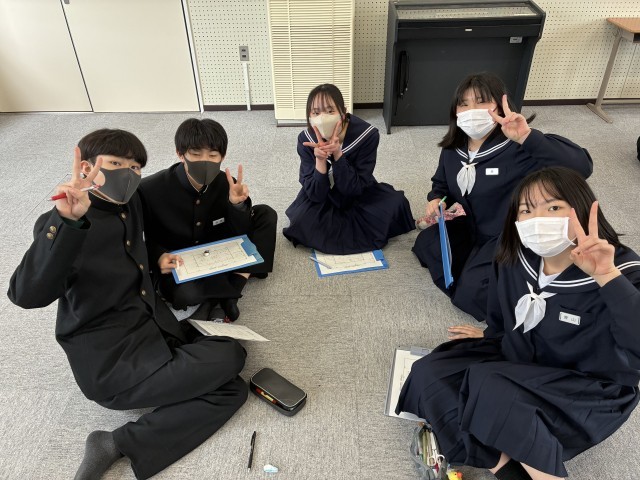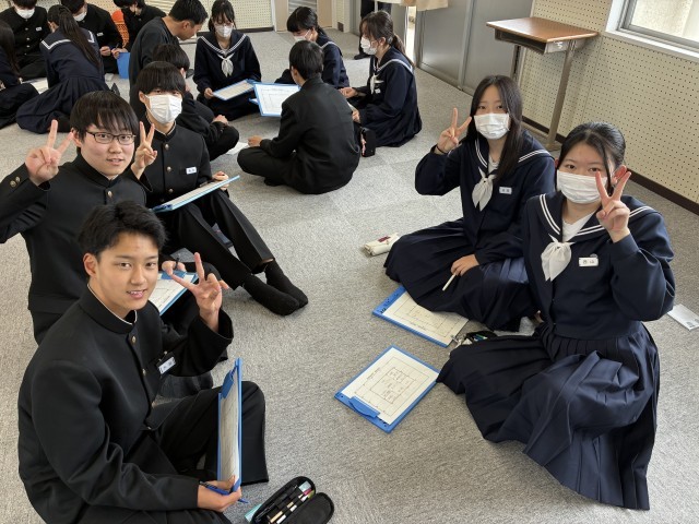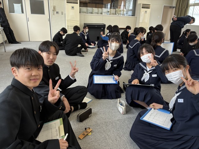 まずは、一人一人が3年生の思い出をマスに書き入れ、次に3年間の思い出を書き足し、グループになって沢山の思い出を振り返りました。友達の発表で同じ内容が書いていたら印を付けて、縦や横に5つ並んだらビンゴ!