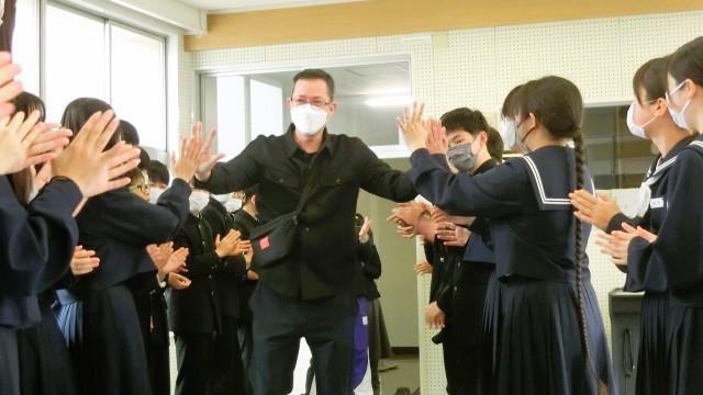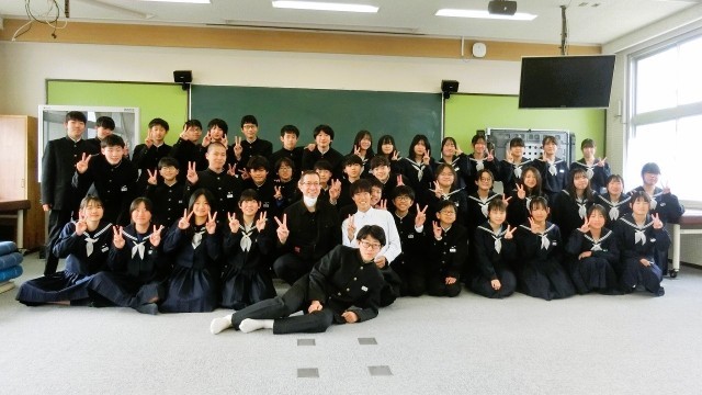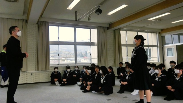 ALTのJoe先生が2月末で本校での勤務を終えることになり、期末テストがすべて終わった4時間目に、各学年ごとにお別れのあいさつをしていただきました。