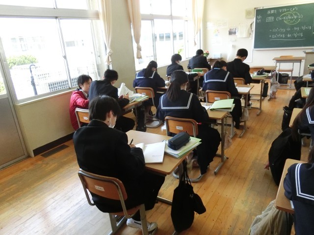 3Bは数学の授業で式の展開を学習しています。もくもくとワークを学習していました。教員2人体制で授業に取り組んでいます。