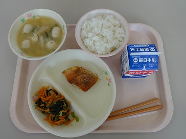 ごはん 赤魚の煮付け 小松菜のおひたし さといもの味噌汁 牛乳 722kcal