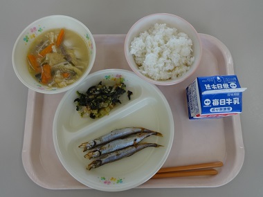ごはん 焼きししゃも3尾 小松菜のおひたし 里芋の味噌汁 牛乳 730kcal