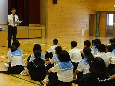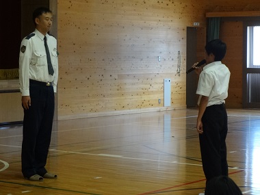 かつらぎ警察交通課様が、わかりやすくていねいに自転車の安全な乗り方についてお話をしてくれました。また、体育館いっぱいの大スクリーンをつかって、危険な自転車の乗り方や事故につながる状況をDVD動画で紹介してくれました。ケガや病気にかからず元気に学んで、運動をして、社会の一員として成長し卒業することが親孝行です。今日の講義を活かして交通安全をこころがけてください!1A学級委員の楠本理央クンがお礼を述べ安全教室は終了しました。