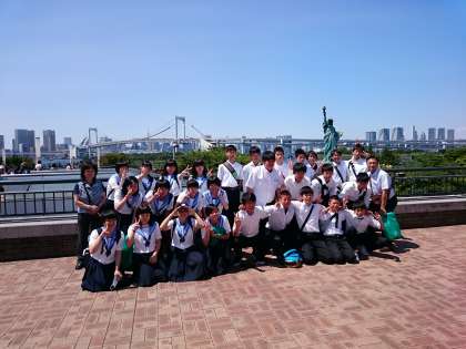 お天気がよく、女神像とレインボーブリッジをバックに。 もうすぐ東京にさようならです。