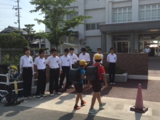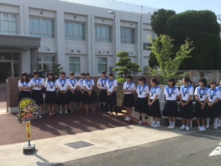 妙寺小学校正門前でテニス部男子とバレーボール部がご挨拶!
