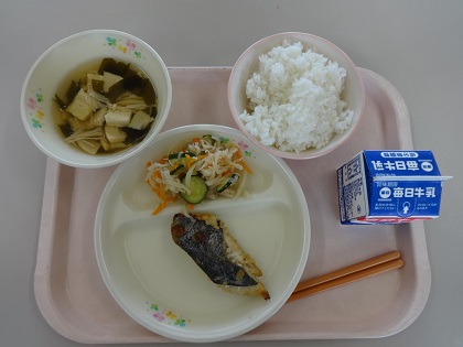 ごはん すずきの金山寺味噌マヨ焼き 切干し大根の酢の物 竹の子とワカメのすまし汁 牛乳 737kcal