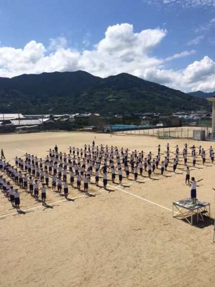 午前中の晴れ間を利用して、初めての外練習をしました。真夏を思わせる太陽に照らされて、水分を含んだ地面がみるみる蒸発して蒸せ返るなか、生徒諸君はよく頑張っています!