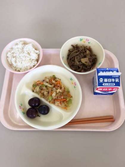 牛肉の炒め煮(牛肉 こんにゃく 玉葱 カマボコ 椎茸 ネギ)