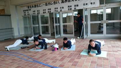 雨のため、外周ランニングのあと、筋トレを元気よくやってます。
