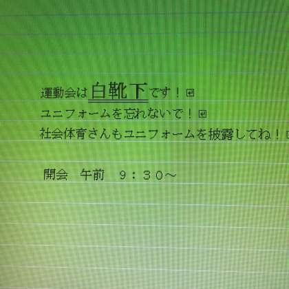 忘れないで! 公開日 2016/09/16 更新日 2016/09/16 お知らせ 明日は真夏日まで気温が上がるという予報です。水分をたくさん持たせてください。中学校は、教室で生徒達でお弁当です。ご了承ください!