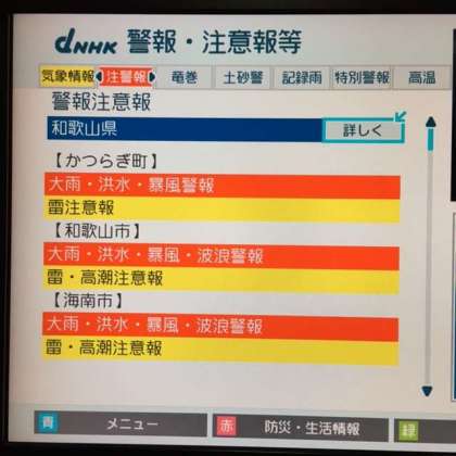 大雨、洪水、暴風警報が、かつらぎ町に発令されています。自宅で待機してください。午前8時30分を過ぎても、警報発令中の場合、学校は臨時休校となります。