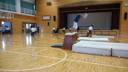 前方倒立回転跳びです。しっかり支持が大切。足をのばし、大きく回るときれいに着地てきます。