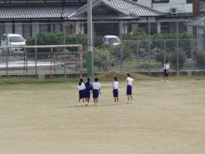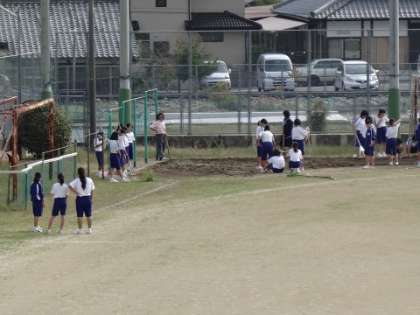 走り幅跳び!三方向から跳ぶグループ。記録をメジャーで測るグループ。砂場を平らにならすグループ。順番を待つグループ。しっかりと協力ができます。