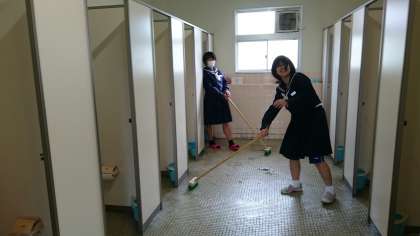トイレ掃除も笑顔、デッキブラシでシュッシュシュッシュ。きれいになりました。