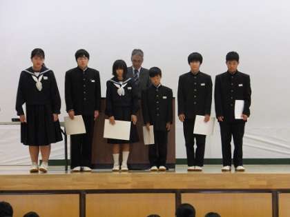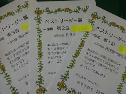 画面左から3名が学校図書の本をたくさん借りて読書した1位2位3位です。学級として図書室利用1位が1A・2位3A・3位1Bでした。図書委員会が集計してくれたベストリーダー賞です。