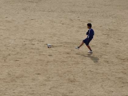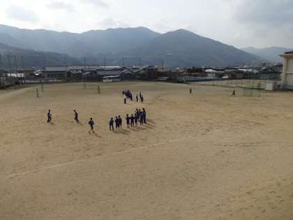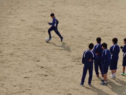 運動場で授業ができました。ドリブル技能とボールを運んでシュートする技能を試しています!
