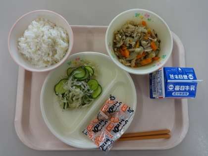 玄米ごはん 豚肉ときのこの炒め物 きゅうりとじゃこの和物 豆つぶころころ1袋 牛乳 817kcal