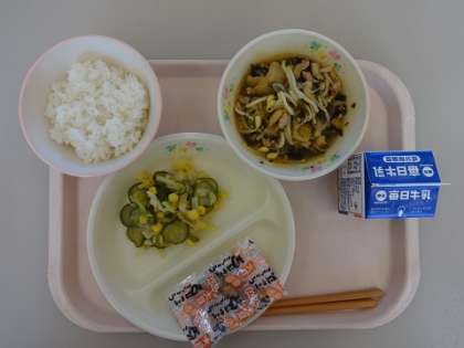 ごはん チゲラーメン きゅうりとコーンの中華和え 豆粒ころころ1袋 牛乳 743kcal