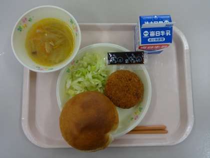 ※セルフサンド(丸パン キャベツ メンチカツ ソース1袋) コンソメスープ 牛乳 912kcal