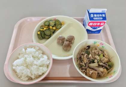 ○ごはん ○豚肉と大根の中華煮 ○きゅうりとコーンの中華あえ ○シュウマイ 875カロリー