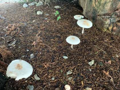 朝から蒸し暑く、汗が流れてくる気候です。中庭の木の下に白いキノコを見つけました。湿気も多くキノコにとっていい環境の場所だったようです。