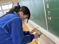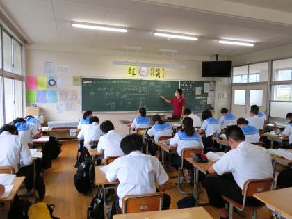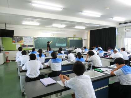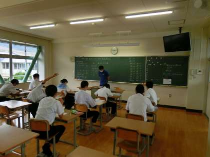 3A理科、3B数学。数学は2教室に分かれての学習。理科はプロジェクターで写真を黒板に写して物体の運動について学んでいました。