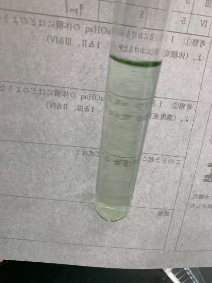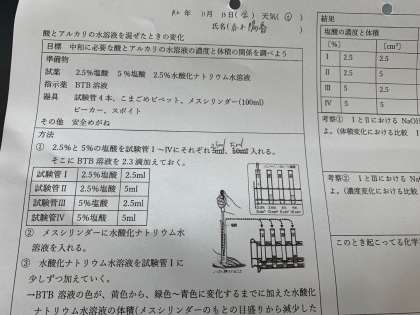 BTB溶液の入った塩酸に、水酸化ナトリウム水溶液を入れて中性(緑色)にするのにどれだけの水溶液が必要か調べていました。