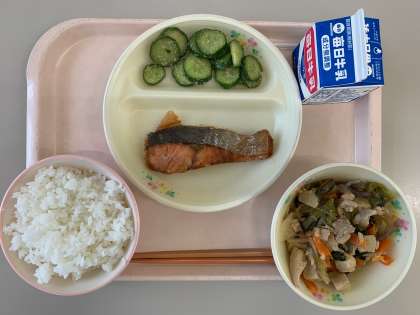 ●ご飯 ●鮭の塩焼き ●高野豆腐の煮物 ●きゅうりのごま和え 783キロカロリー