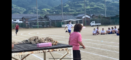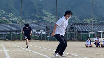 100メートル走の説明では、野上先生と3年生花川君が本番さながらに走り、見事花川君勝利でした。