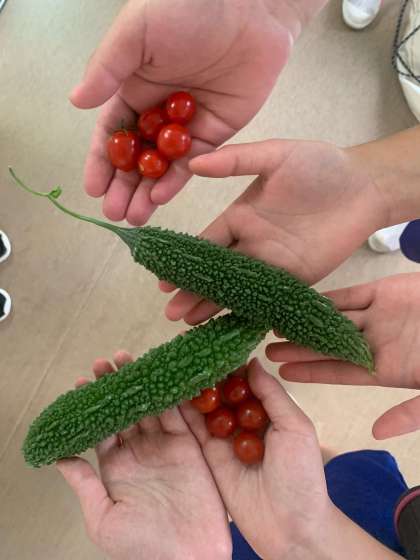 プール横でゴーヤやプチトマトを育てました。立派に育ったゴーヤやとプチトマト。美味しくいただいてくださいね。