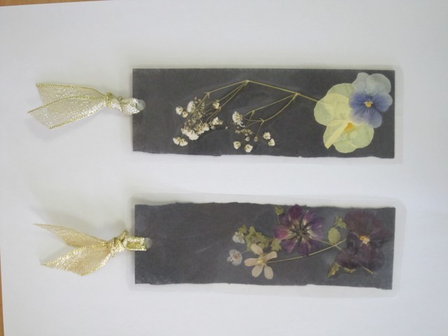一昨日(水曜日)、栞を作成しました。以前に採ってあった花の中から選んで台紙に貼り付けラミネートをしました。黒い台紙を選んだので目立たないかなと思ったのですが、シックないい感じの栞が出来ました。作成したAさんは本をよく読んでいるので喜んでいました。
